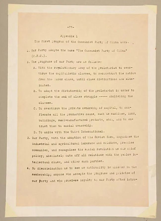 不久之后的1960年,美国学者韦慕廷在哥伦比亚大学图书馆发现了1924年1月陈公博写的硕士论文《共产主义运动在中国》。在附录中,出现了《中国共产党第一个纲领》的英文版。