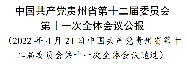 中国共产党贵州省第十二届委员会第十一次全体会议,于2022年4月21日在贵阳举行。省委委员64人出席会议。省纪委委员和有关方面负责同志列席会议。