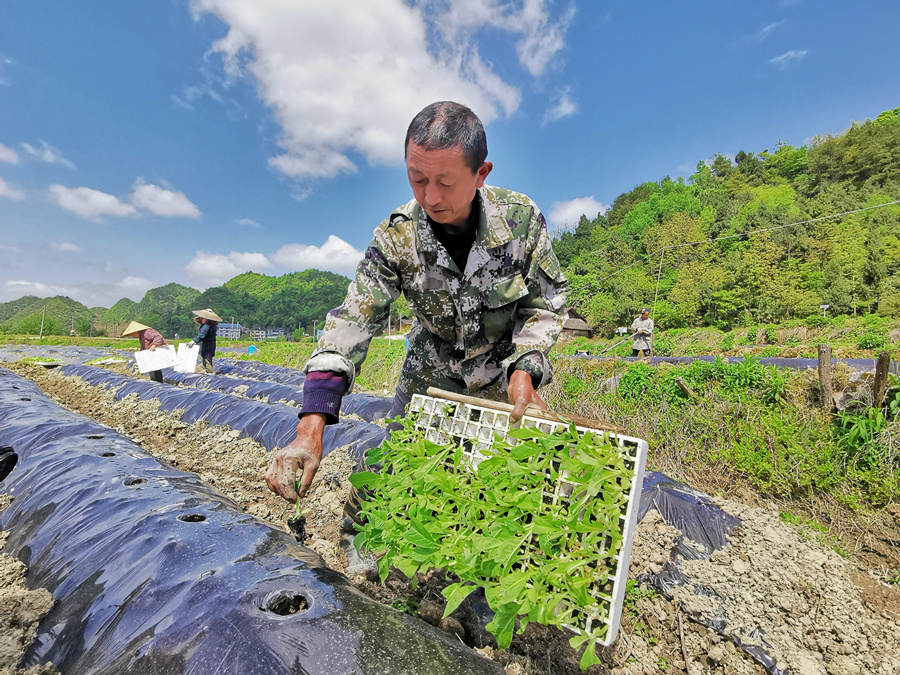 “80元一天,中午还包餐饭,离家又近,又能照顾家庭,挣点小钱。”正在移栽烟苗的客楼镇安山村村民邓有芬高兴地说。