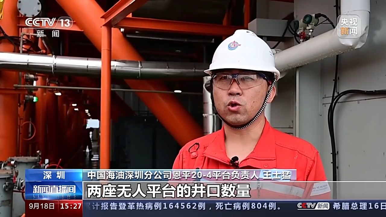 中国海油深圳分公司恩平20-4平台负责人 王士猛:两座无人平台的井口数量、原油生产能力相当于一座万吨级的大型传统平台,而重量、面积仅为传统平台的三分之一,降低工程投资约2.8亿元,减少日常维保工作量近三成,每年可节省运维成本超千万元。