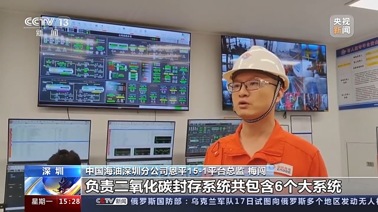 中国海油深圳分公司恩平15-1平台总监 梅闯:负责二氧化碳封存系统共包含6个大系统,28个单机设备,我们按照“划专业、划系统、划设备”的原则,精心管理每一台设备,确保二氧化碳封存设备无故障运行。