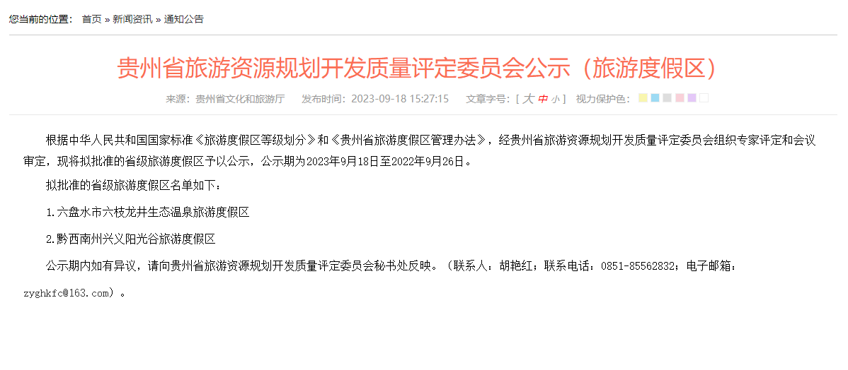 根据中华人民共和国国家标准《旅游度假区等级划分》和《贵州省旅游度假区管理办法》,经贵州省旅游资源规划开发质量评定委员会组织专家评定和会议审定,现将拟批准的省级旅游度假区予以公示,公示期为2023年9月18日至2022年9月26日。