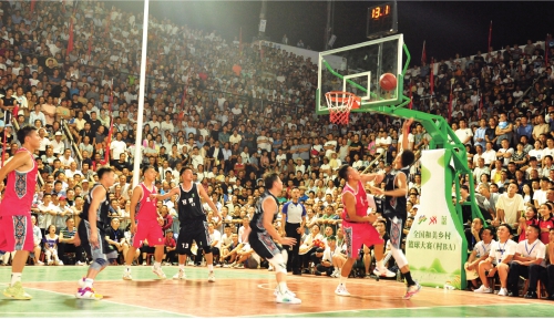 村BA揭幕式友谊赛,贵州黔东南州农民篮球队对阵甘肃临夏州农民篮球队,比赛紧张激烈,扣人心弦。