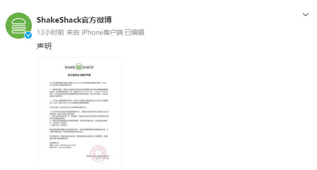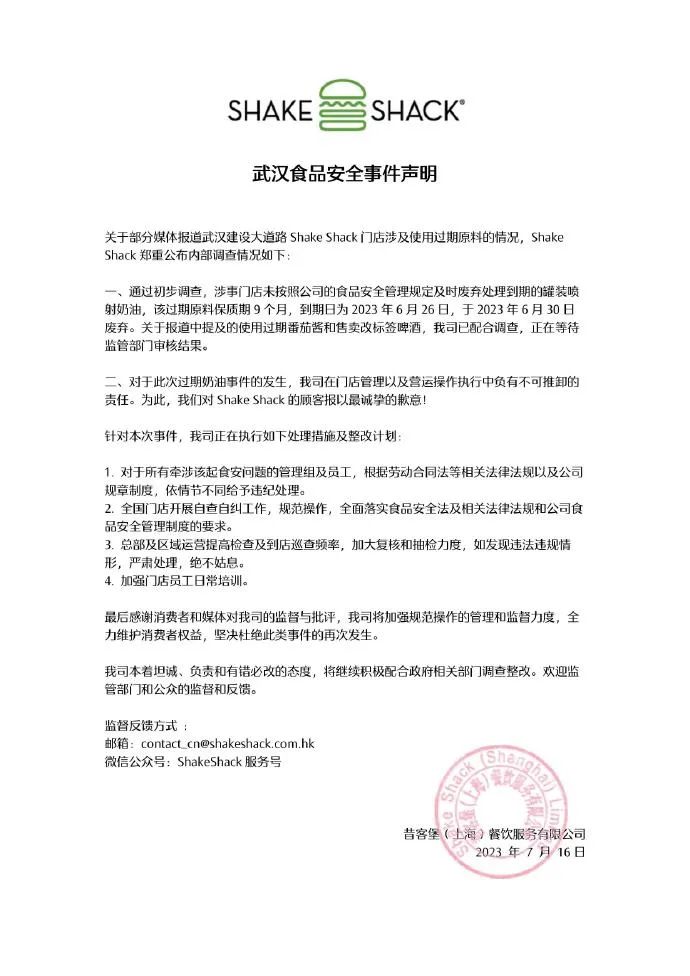针对被曝武汉门店使用过期原料情况,7月16日23时快餐品牌@ShakeShack官方微博 公布内部调查情况并致歉: