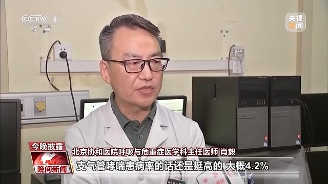 北京协和医院呼吸与危重症医学科主任医师 肖毅:根据流行病学统计,支气管哮喘患病率的话还是挺高的,大概4.2%,也就是100个病人当中有4.2个支气管哮喘病人。