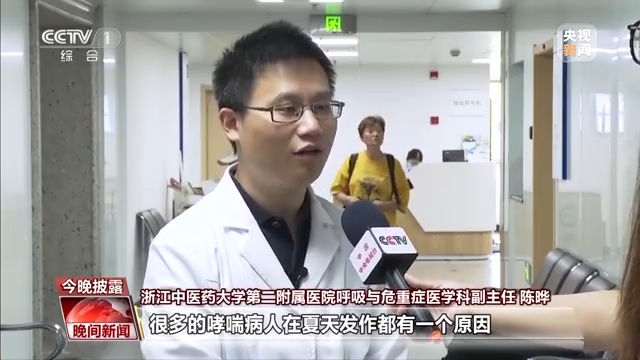 浙江中医药大学第二附属医院呼吸与危重症医学科副主任 陈晔:很多的哮喘病人在夏天发作都有一个原因,就是室内空调使用不当,一个是冷空气的刺激,一个是空调长期不用以后就会有很多病原学微生物。