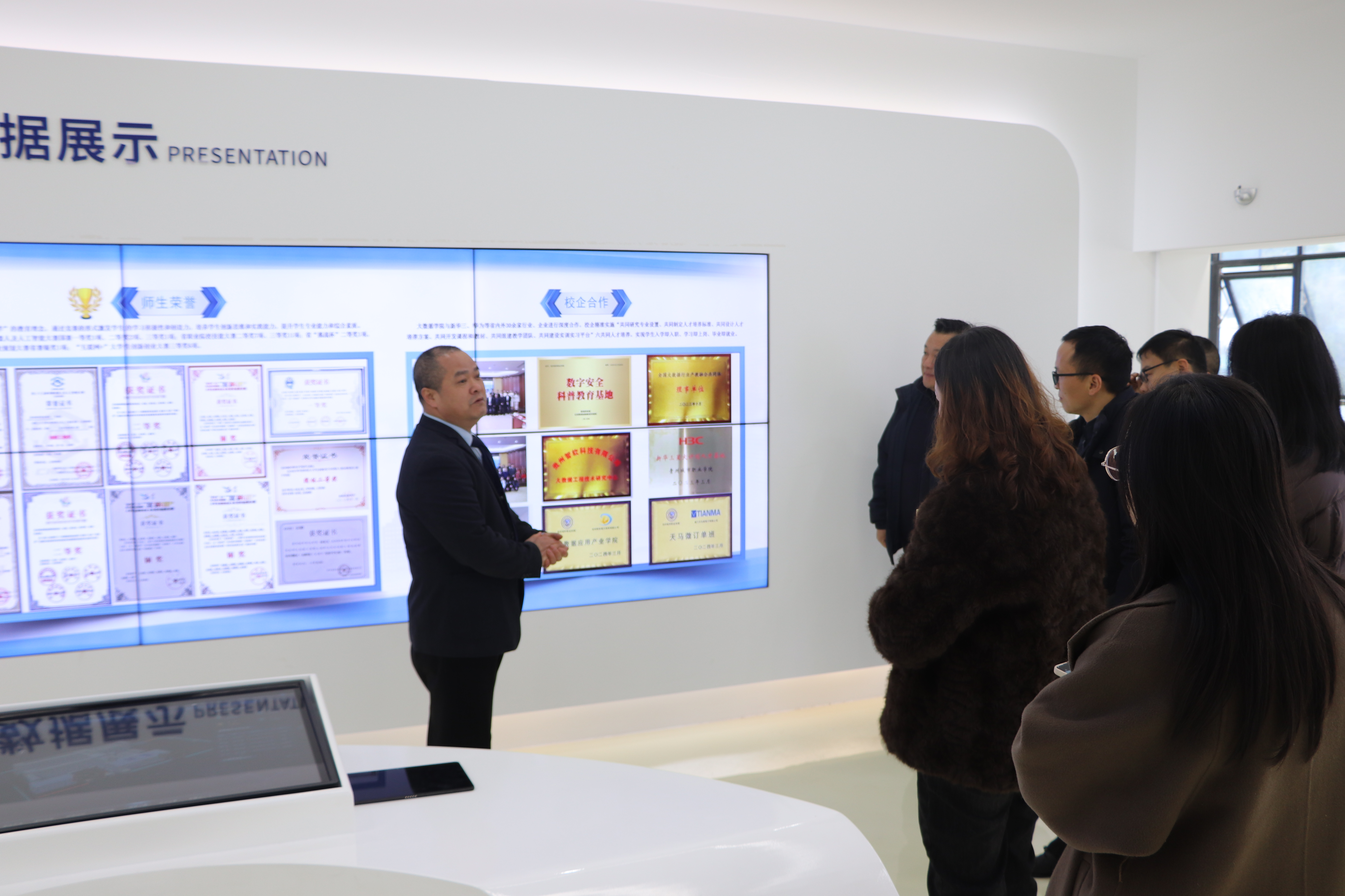 在大数据学院领导的陪同下,刘璐书记一行先后参观了贵州城市职业学院大数据学院展厅、相关专业实训室以及 VUE 考试中心。大数据学院院长杨庆虎围绕“党建+实践教学”融合建设成效作了重点介绍。刘璐书记对大数据学院坚持以党建为引领、推动党建与教学实践深度融合的做法给予了充分肯定。
