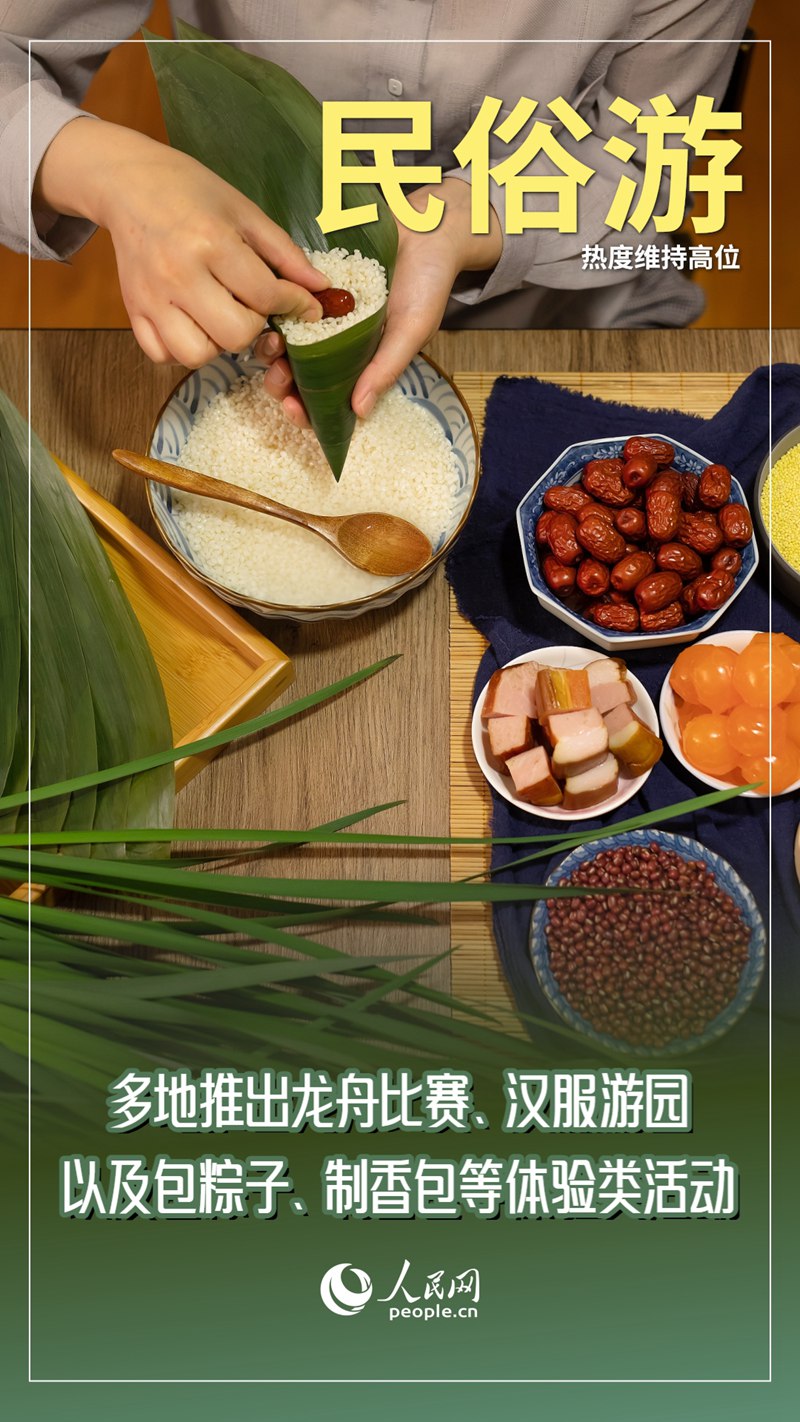 民俗游热度维持高位,文化和旅游产品供给丰富。传承优秀传统文化成为端午节假日旅游市场的重要特征,多地推出龙舟比赛、汉服游园以及包粽子、制香包等体验类活动,融“传统文化风俗”于“旅游度假场景”,为游客提供更多消费选择。山东泰安举办“天烛胜境”端午民俗文化祈福节,推出“千年非遗——火龙钢花”等夜间表演。贵州贵阳举办“我们的节日·端午节暨非物质文化遗产传承系列活动”。甘肃天水推出“着汉家服饰,游玉泉仙境”、“诗礼雅韵 醉美秦风”端午诗会等活动。云南楚雄专门推出多条端午节主题游线路,带游客体验包粽子、制香囊、划龙舟等多彩民俗文化。青岛崂山风景区推出“免门票”大礼包,并面向广大游客发放专项消费券,进一步助力企业纾困。