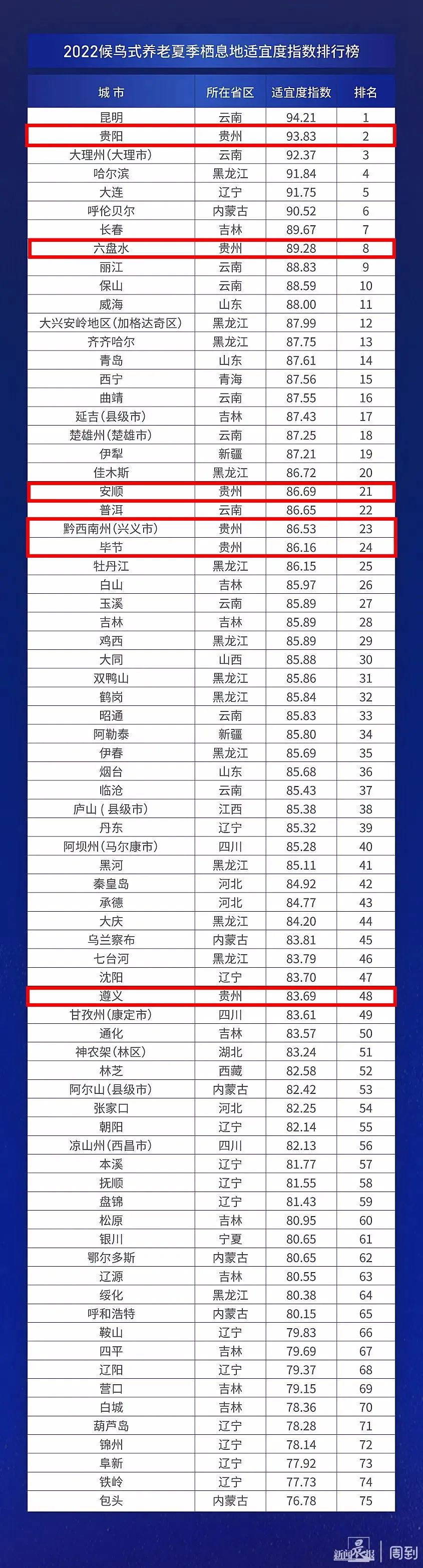 7月14日,上海交通大学发布《2022中国候鸟式养老夏季栖息地适宜度指数》,对 75个候选城市进行综合评价,云贵高原的优势十分明显,我省入列六席,分别为贵阳、六盘水、安顺、黔西南(兴义市)、毕节、遵义,分别位列第2、第8、第21、第23、第24和第48名。