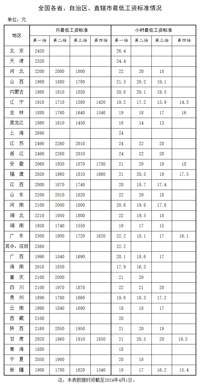 近日,人社部官网公布了全国各省、自治区、直辖市最低工资标准情况(截至2024年4月1日)。其中:上海月最低工资标准2690元,为全国最高;北京小时最低工资标准26.4元,排名居首。江苏省第一档月最低工资标准为2490元,第一档小时最低工资标准为24元。