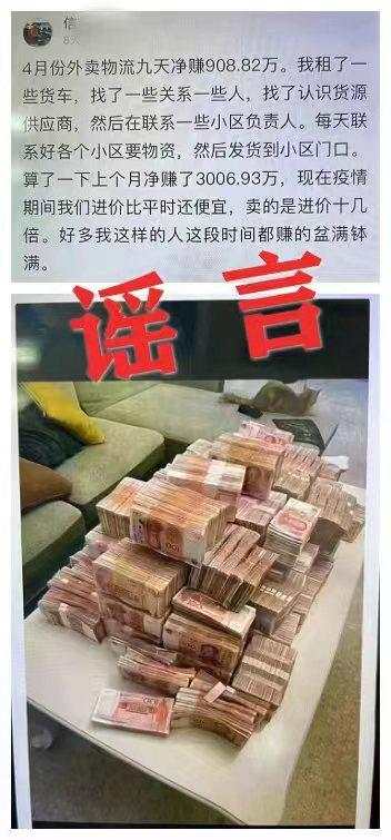 近日,一篇所谓“个人利用疫情高价倒卖物资,一个月获利上千万”的帖子在网络流传。经警方调查,信某(男,32岁)疫情防控期间封控在家,为博取眼球、吸引关注,于2022年4月10日在网上虚构了自己“在疫情防控期间租用货车,高价倒卖物资,仅九天净赚人民币908.82万元,3月份赚了人民币3006.93万元”等不实言论,并配了一张从网上下载的桌上堆满人民币的照片,引起网民大量关注,产生不良社会影响。目前,信某因虚构事实扰乱社会秩序被上海闵行警方依法行政处罚。