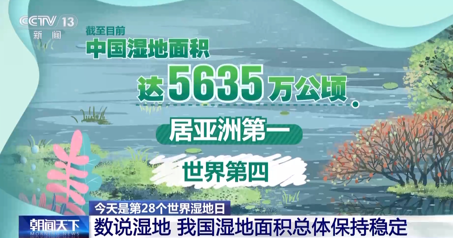 昨天是世界湿地日,截至目前,中国湿地面积达5635万公顷,居亚洲第一,世界第四。中国以全球4%的湿地面积,满足了世界1/5的人口对生产、生活、生态和文化的需求。