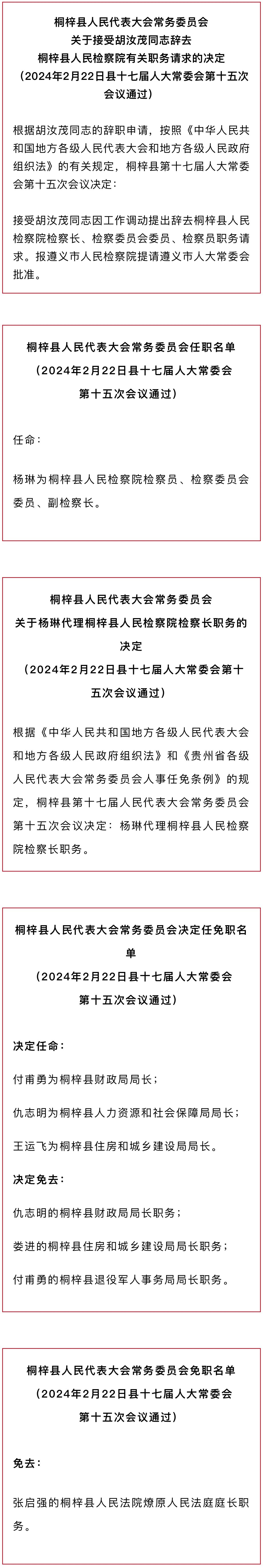 遵义市桐梓县人民代表大会常务委员会决定任免职名单