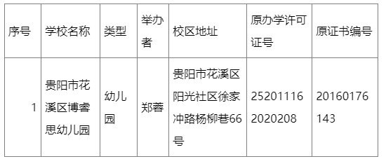 贵阳市花溪区博睿思幼儿园因生源骤减使幼儿园收入减少,决定不再继续办园,经花溪区教育局批准,已同意贵阳市花溪区博睿思幼儿园停止办学申请。