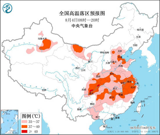 预计8月4日白天,陕西南部、河北大部、北京、天津、山东、河南、安徽、江苏、上海、湖北、湖南大部、江西中北部、浙江、福建西北部、四川东部、重庆、贵州东部和南部、广西西部等地有35℃以上的高温天气,其中,陕西南部、河北东部和南部、天津南部、山东北部、河南中南部、安徽西部和南部、江苏中南部、上海大部、湖北西部、湖南北部、江西北部、浙江、四川东部、重庆、贵州东北部等地部分地区最高气温37~39℃,重庆局地可达40℃以上。