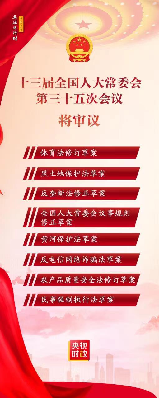 十三届全国人大常委会第三十五次会议今天下午在京开幕。黑土地保护法草案、反垄断法修正草案、反电信网络诈骗法草案等多件法律草案提请会议审议。
