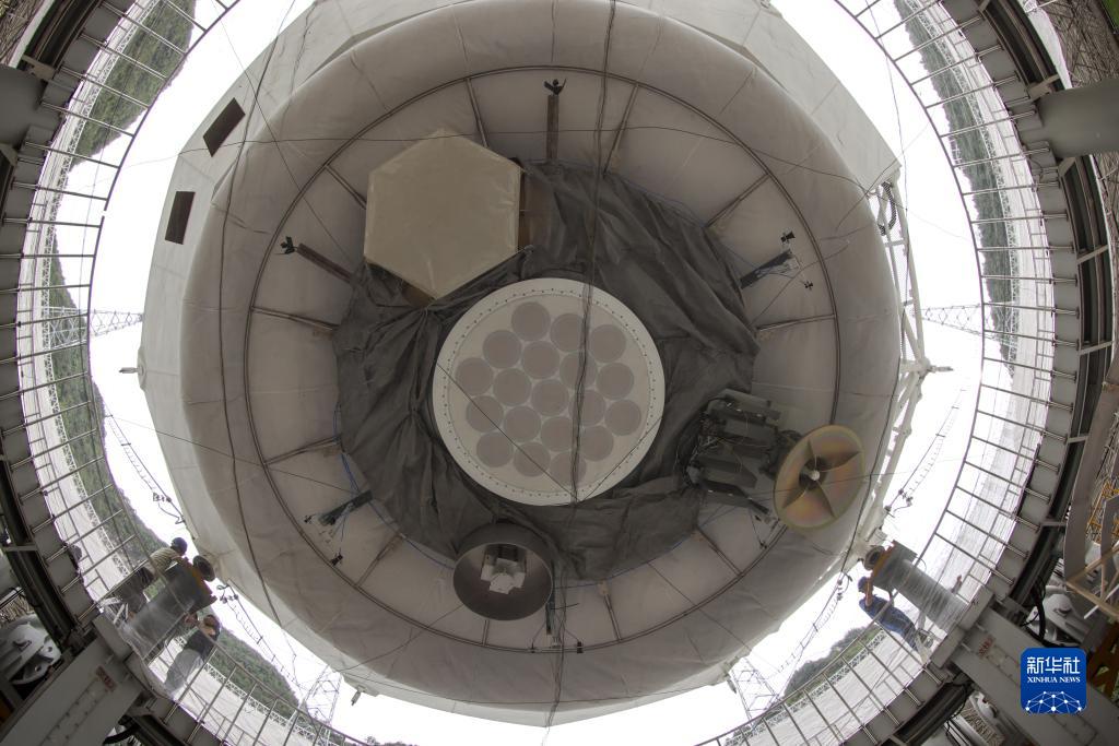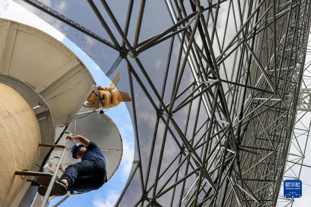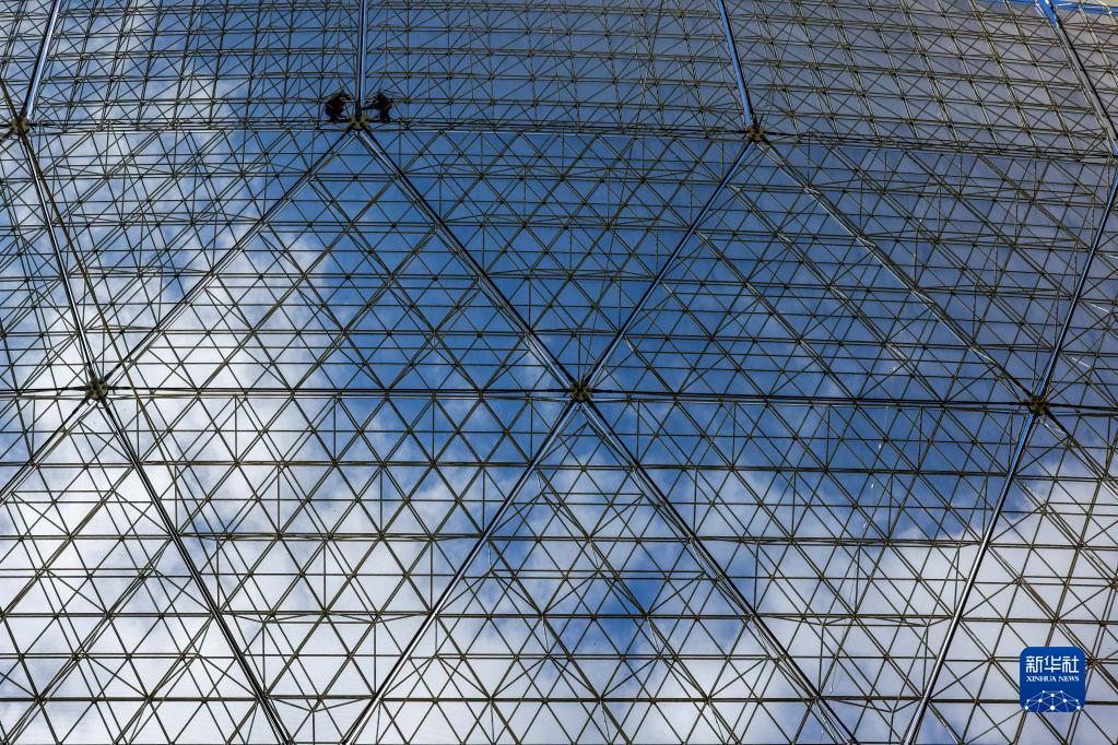 7月20日,工作人员对“中国天眼”的馈源舱进行维护保养。