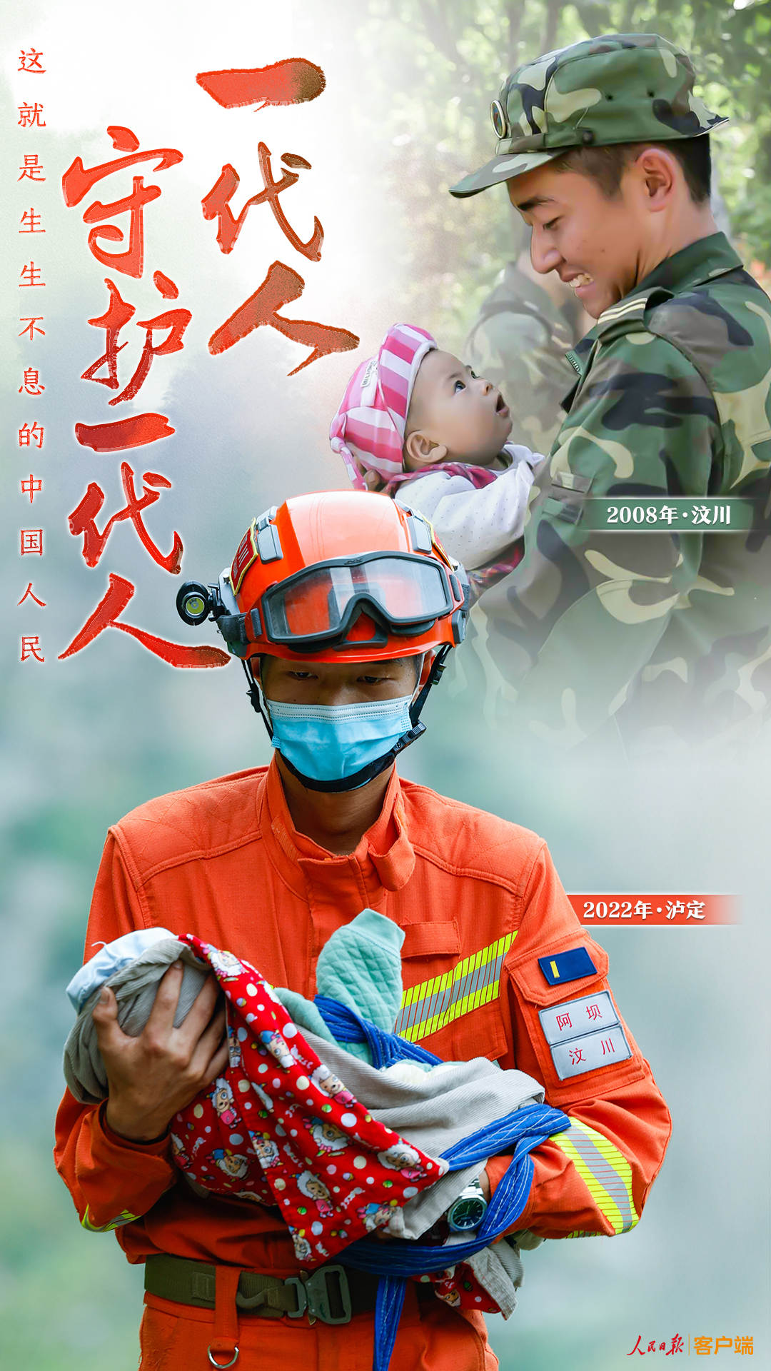 2022年,泸定地震。在汶川地震后长大的消防员张自立抱着一名婴儿从灾区疏散。