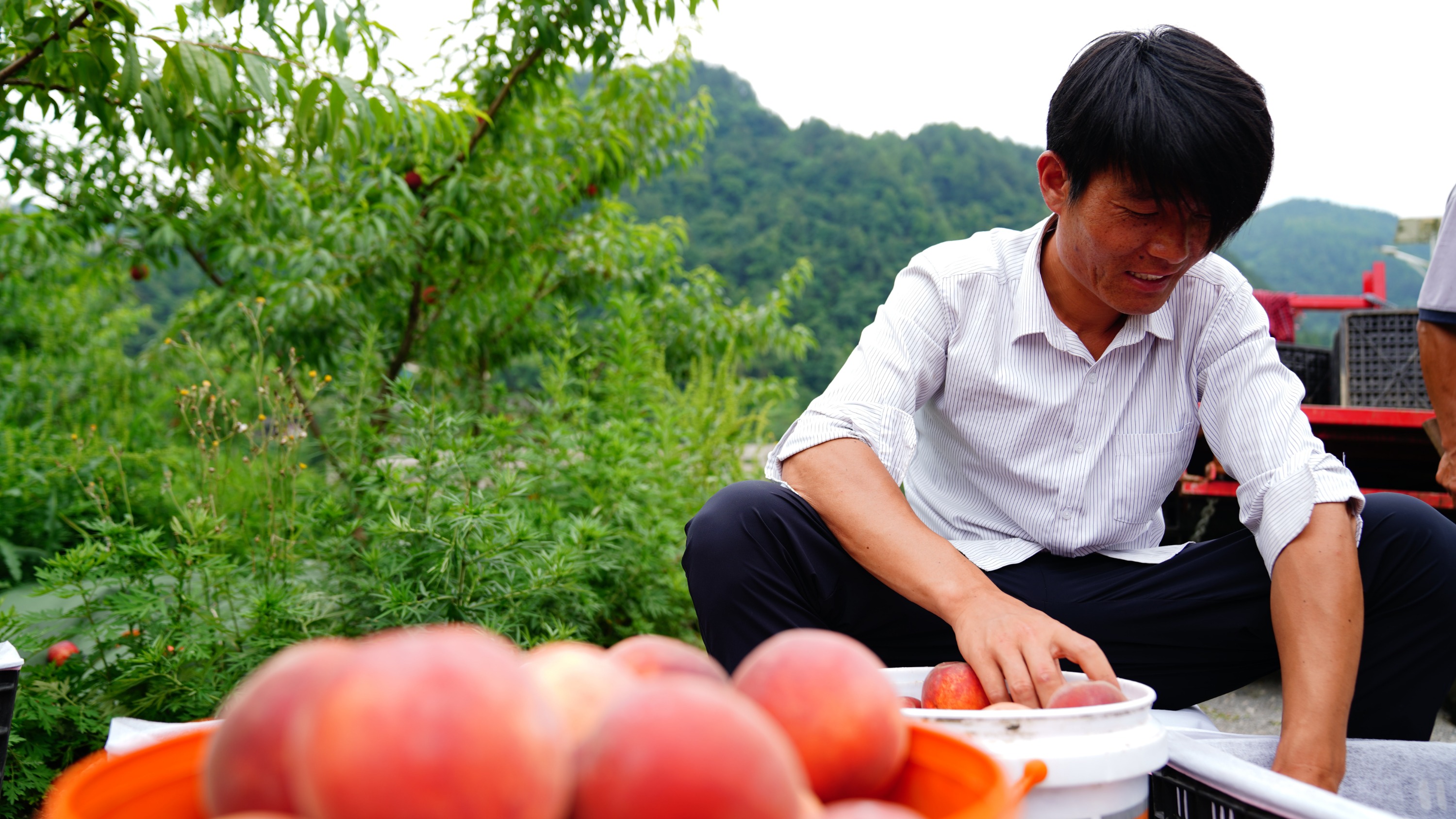 在大河坝镇马鞍村桃子种植基地,当地群众正按照技术人员的要求,挑选、采摘个头大的桃子。