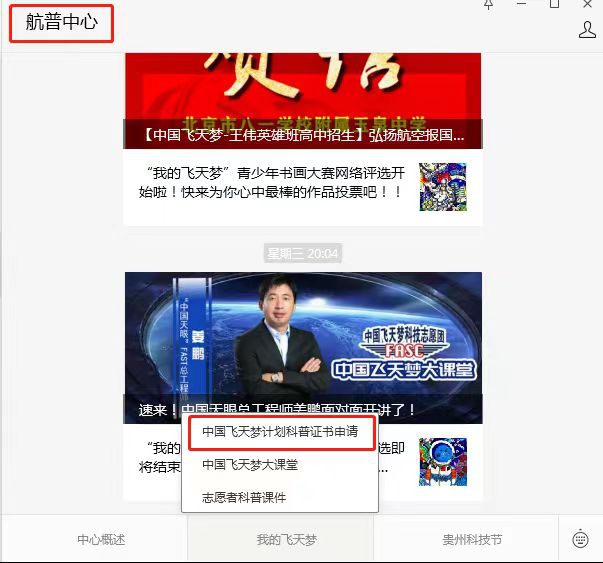 2.向科普专家提问:进入航普中心公众号,点开下方的“我的飞天梦”栏目,进入“中国飞天梦大课堂”系统中进行提问,将会有机会得到科学家、专家的回复(详见参与流程)。
