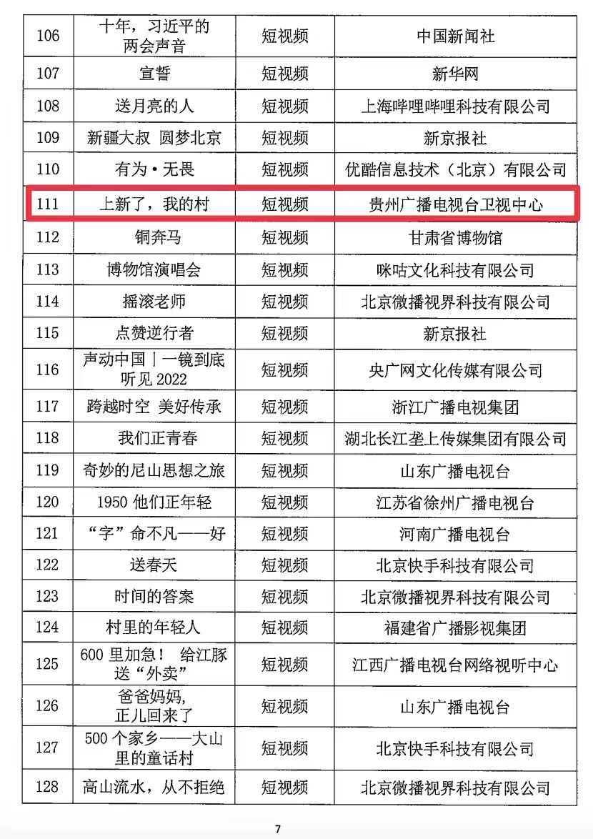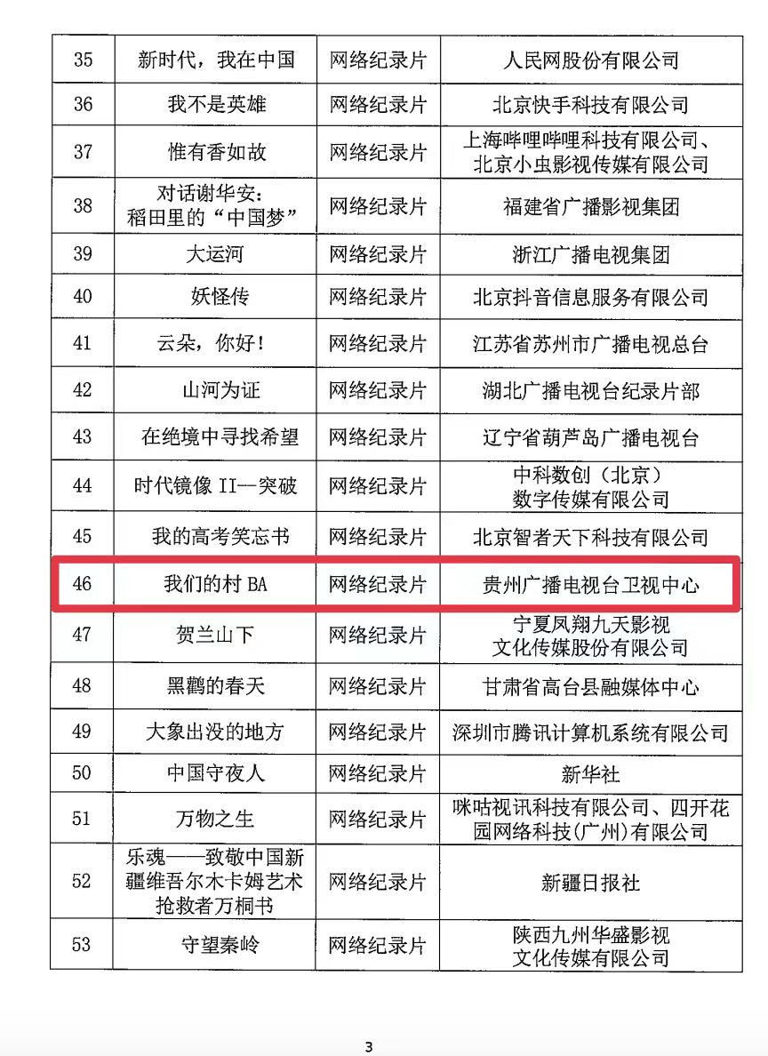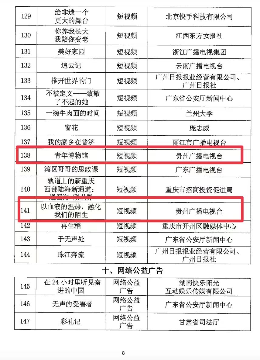 其中,贵州广播电视台卫视中心的2部作品《我们的村BA》《上新了,我的村》分别入选“优秀网络纪录片”和“优秀短视频”;另外,贵州广播电视台的2部作品《青年博物馆》《以血液的温热,融化我们的陌生》入选“优秀短视频”。