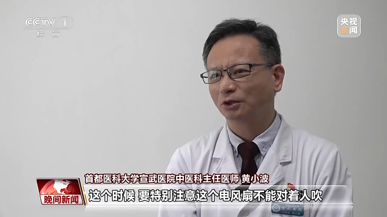 首都医科大学宣武医院中医科主任医师 黄小波:要注意避风邪和寒邪,大家为了过好这个伏天,电风扇、空调都开得特别特别低。这个时候,要特别注意电风扇不能对着人吹,空调不能开得太凉、太低,尤其晚上睡觉的时候,窗户不要对着人。把心养好,心平气和了,心静自然凉。
