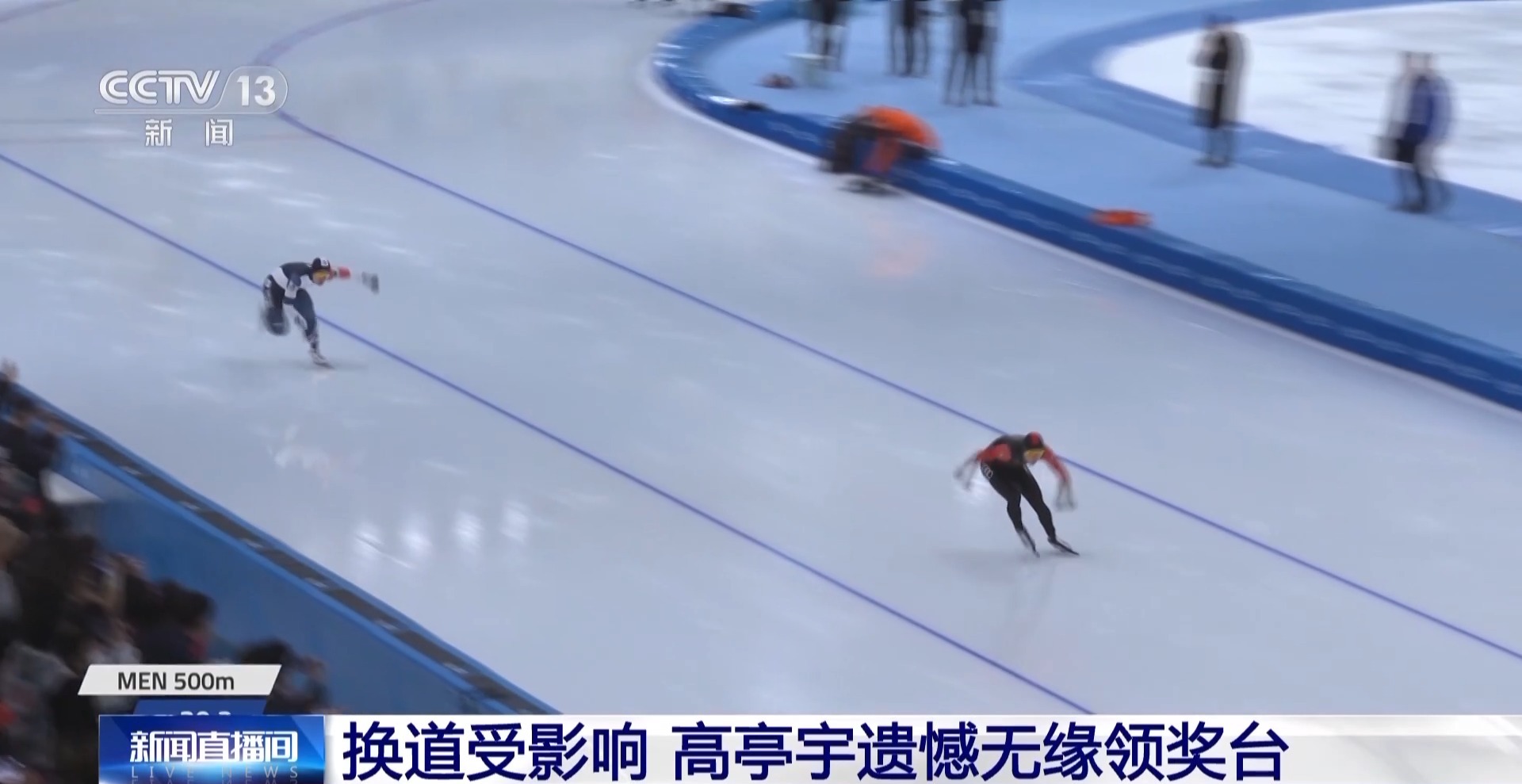 凭借着首日男子500米第一次B组第一的成绩,昨晚的第二次较量,高亭宇晋级A组的比赛。由于有队员赛前临时退赛,在经过出发顺序调整后,本场,高亭宇第二组外道出发,与他同组的是北京冬奥会该项目银牌得主韩国选手车旼奎。前100米,高亭宇的成绩是9秒62,排名第3,但是在进入换道区,他要从外道换向内道的时候,与对手发生了摩擦。