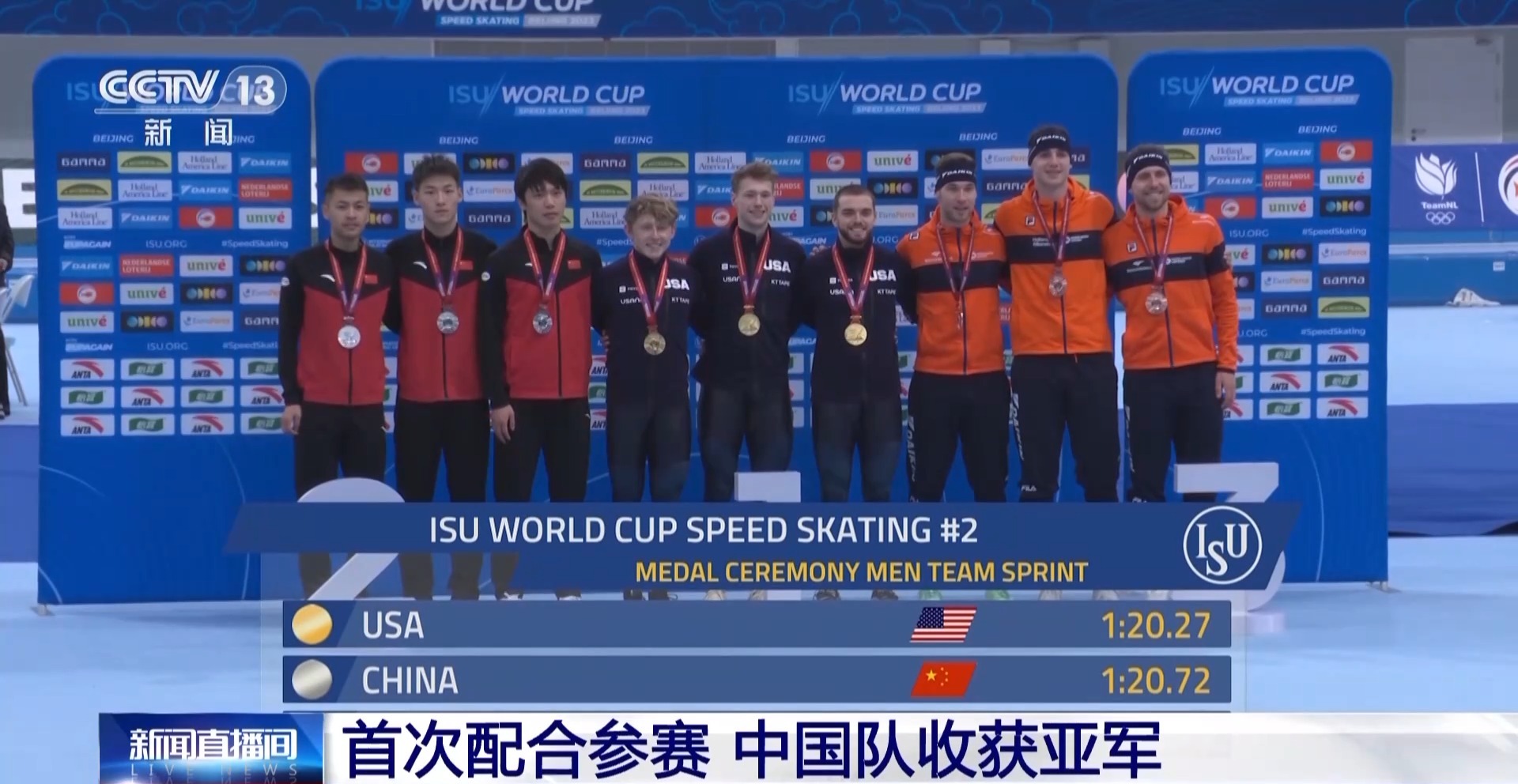 昨晚,由刘斌、都浩楠和宁忠岩组成的中国队,第一次配合参加速度滑冰世界杯北京站,就在男子短距离团体追逐的比赛中,以1分20秒72收获银牌。