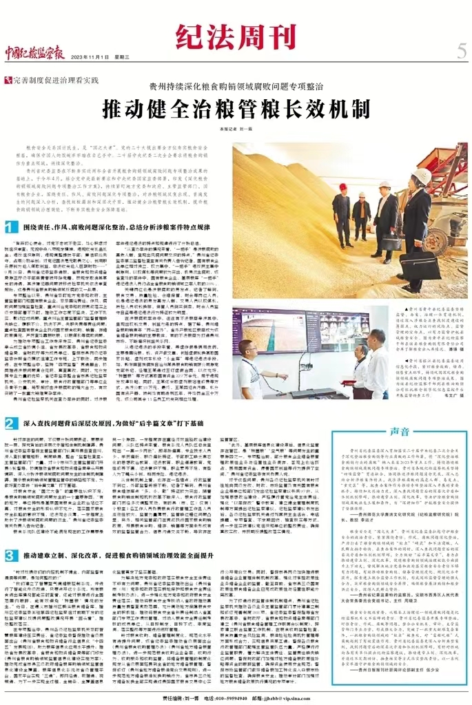 贵州省纪委监委在不断夯实近两年全省开展粮食购销领域腐败问题专项整治成果的基础上,于今年4月,结合党中央最新要求和中央纪委国家监委部署,印发《深化粮食购销领域腐败问题专项整治工作方案》,持续紧盯地方党委和政府、主管监管部门、国有粮食企业,围绕责任、作风、腐败问题深化专项整治,对涉粮领域反复出现、普遍发生的问题深入分析,查找短板漏洞和深层次矛盾,推动健全治粮管粮长效机制,提升粮食购销领域治理效能,不断夯实粮食安全保障基础。