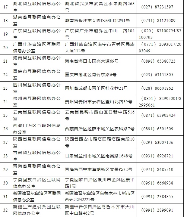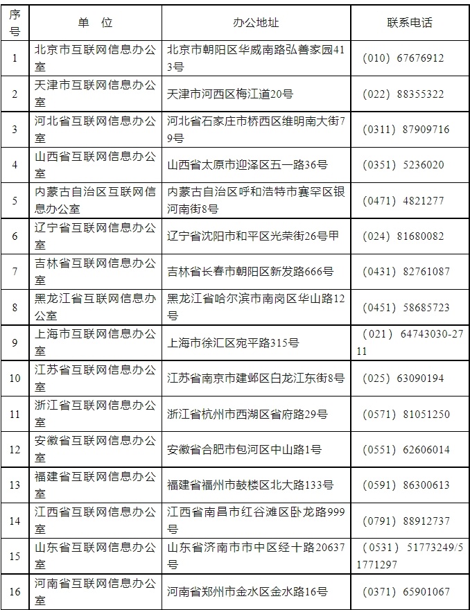 为了指导和帮助数据处理者规范有序申报数据出境安全评估、备案个人信息出境标准合同,现将各地省级网信部门接收申报材料、备案材料的办公地址和联系电话公布如下: