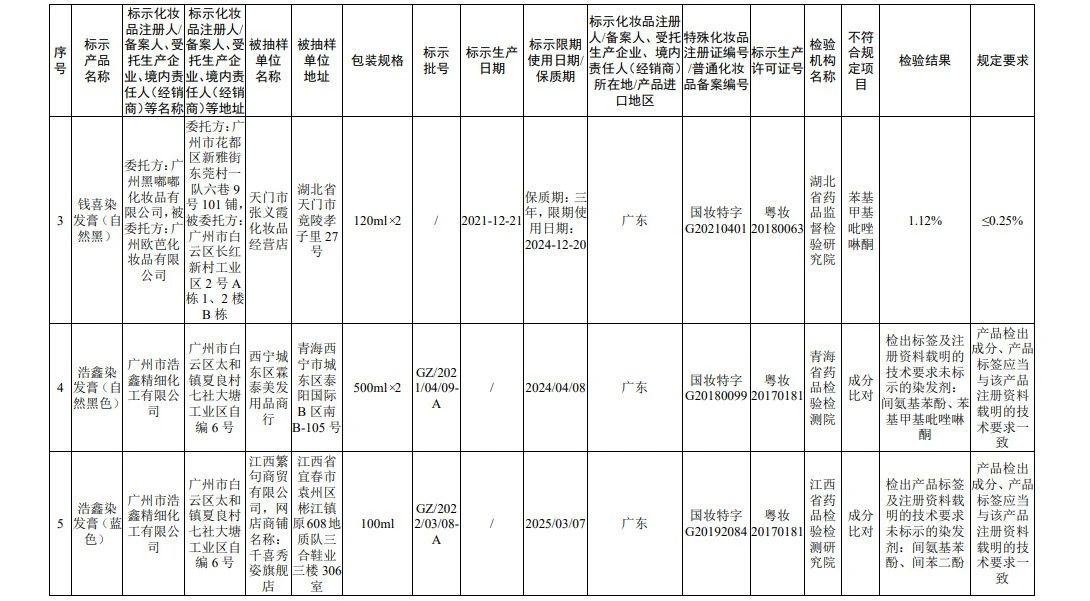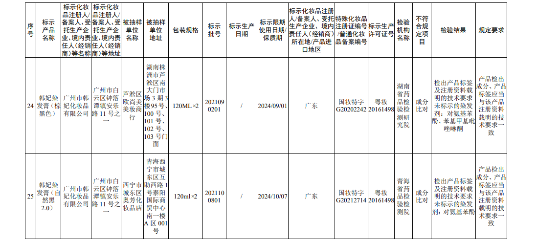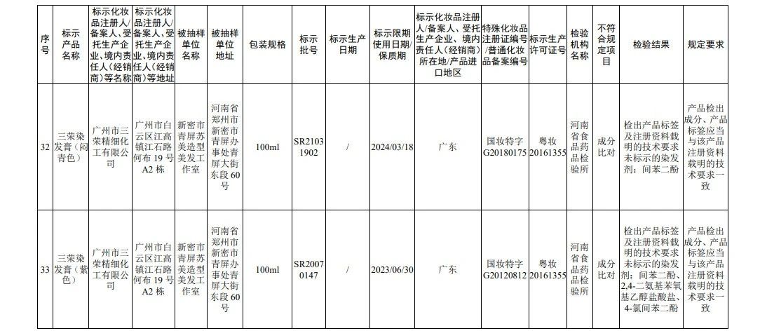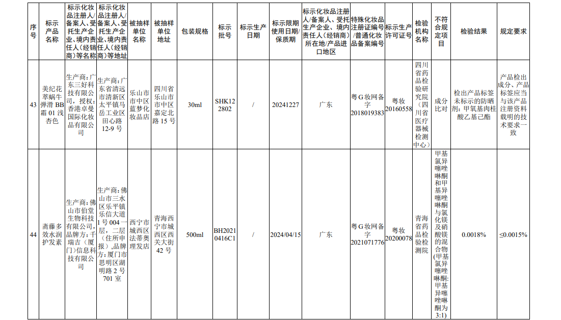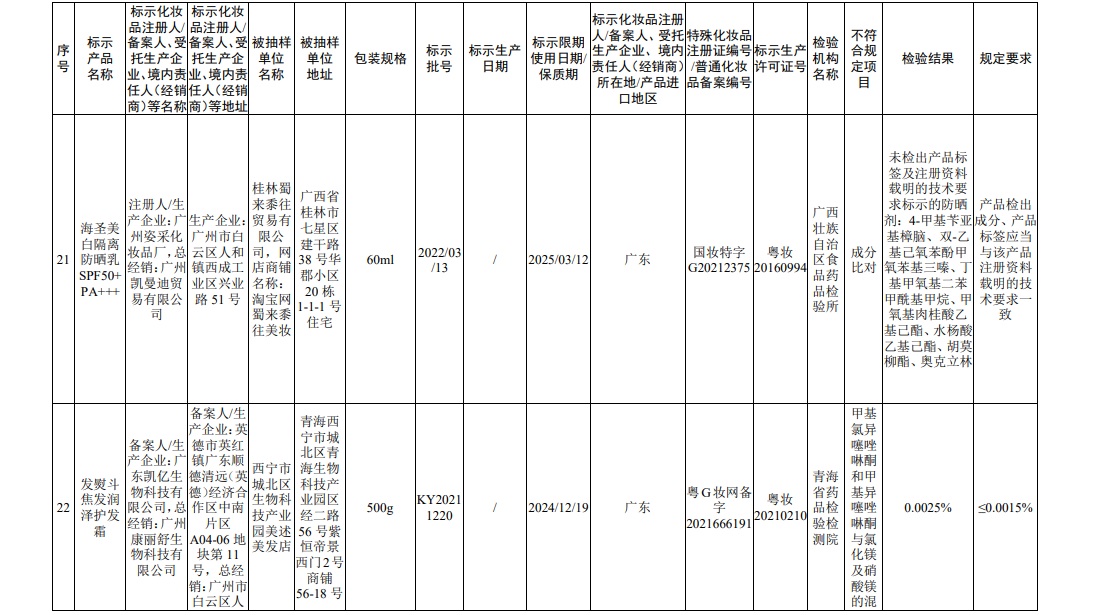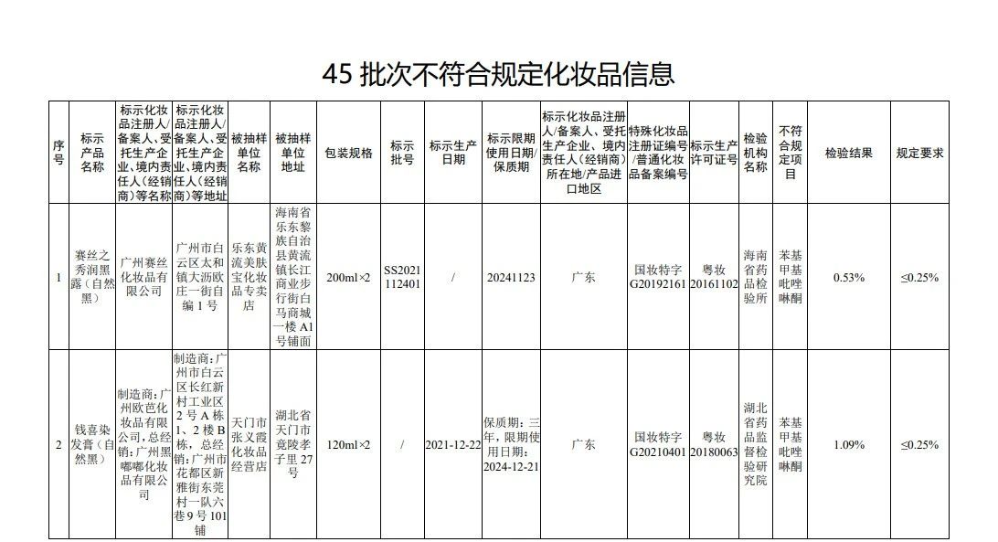据国家药监局网站消息,在2022年国家化妆品监督抽检工作中,经海南省药品检验所等单位检验,产品标签标示为广州赛丝化妆品有限公司生产的赛丝之秀润黑露(自然黑)等45批次化妆品(含牙膏,下同)不符合规定。