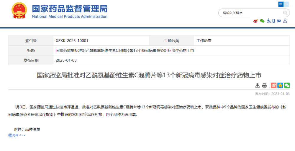 1月3日,国家药监局通过快速审评通道,批准对乙酰氨基酚维生素C泡腾片等13个新冠病毒感染对症治疗药物上市。获批品种中9个品种为国家卫生健康委发布的《新冠病毒感染者居家治疗指南》中推荐的常用对症治疗药物,四个品种为医用氧。