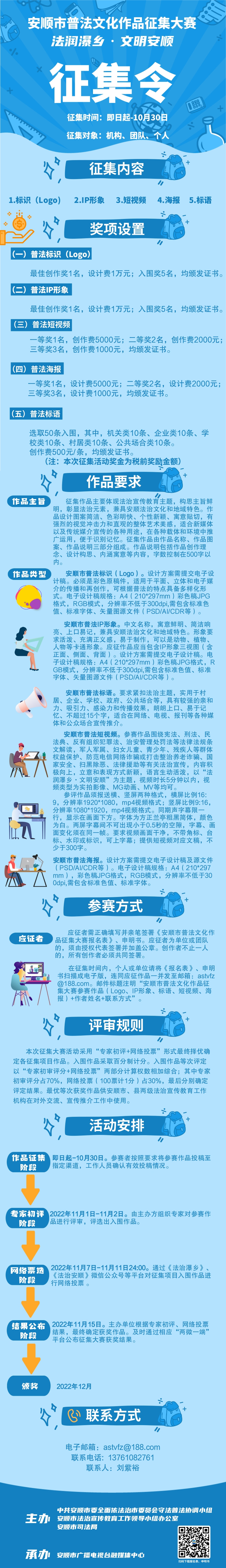 短视频要求参赛作品以“法润瀑乡·文明安顺”为主题,视频时长5分钟以内,视频类型为实拍影像、MG动画、MV等均可。