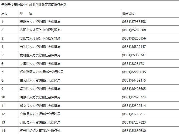 如果您想了解贵阳贵安就业、创业、培训等政策可登录贵阳市人力资源和社会保障网(rsj.guiyang.gov.cn)、贵阳人社微信公众号、贵阳人才网(www.gyrc.cn)或下载“筑人才APP”等平台获取相关信息,或致电12333及各区市县高校毕业生政策咨询电话咨询。