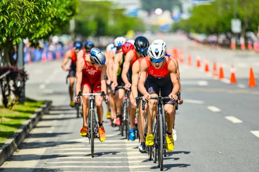 清晨的凤凰湖水温较低,对所有参赛选手来说都极具挑战。游泳赛段异常激烈,第一集团选手始终没能拉开明显距离,17分33秒后,中国选手李嘉兴以微弱优势率先起水,李明旭、滕云峰、仝雨佳、李俊豪等人均紧随其后进入换项区。随后,香港选手Oscar Coggins、Jason Tai Long Ng以及瑞士选手Max Studer等6人迅速完成换向进入自行车赛段。随着大部分选手完成换项,比赛进入自行车赛段,一直没有选手能够成功突围,中国选手李俊豪虽然在自行车赛段第二圈跑出,但他很快就被大集团追上。此后,由17名运动员组成的大集团一直保持到结束自行车赛段后进入转换区。