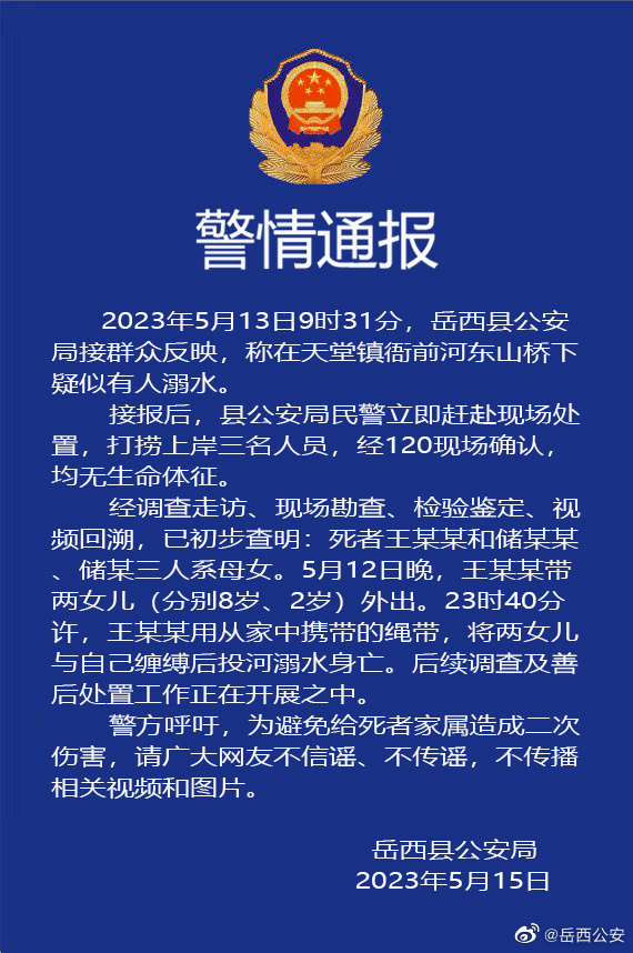 近日,有媒体报道,安徽一女子捆绑两女儿河中身亡。5月15日,当地警方@岳西公安 发布通报。