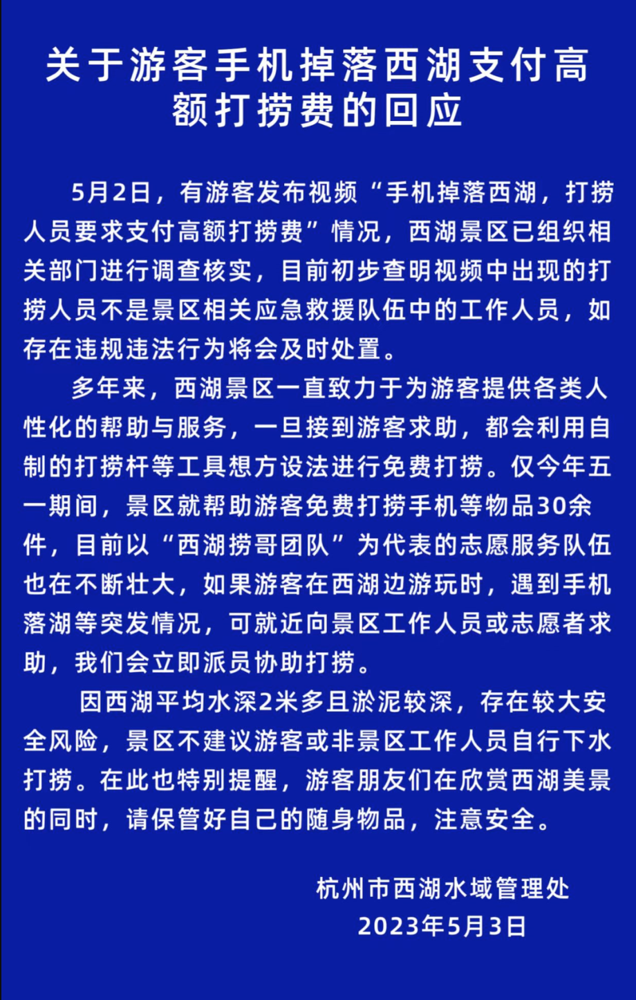 5月2日,杭州有游客发布视频称,手机掉到西湖里,被一位衣服上写着“应急救援”的男子要价1500元捞起,他还称若未捞起半价。