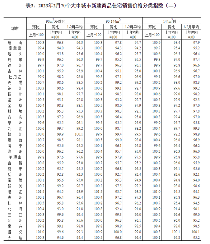 2月份,新建商品住宅上涨城市数量55个,较上月增加19城;持平城市2个,较上月增加1城;下跌城市13个,较上月减少20城。从涨跌幅情况来看,70城平均环比为0.3%;上涨城市平均涨幅0.43%,较上月扩大0.12个百分点。从各等级城市来看,一线、二线、三线城市新建商品住宅销售价格环比分别为0.2%、0.4%和0.3%,至此,一二三线城市环比全部实现回正。