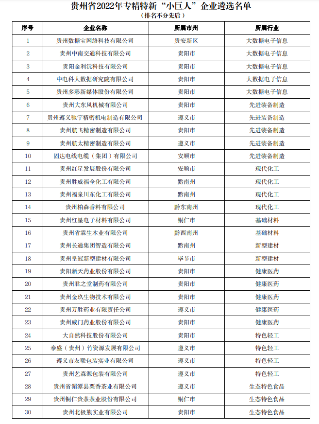 一、遴选贵州数据宝网络科技有限公司、贵州中南交通科技有限公司等30户企业为“贵州省专精特新‘小巨人’企业”。