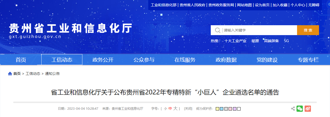 按照《贵州省优质中小企业梯度培育管理实施细则(暂行)》要求,结合《贵州省中小企业“专精特新”培育实施方案》,在省级“专精特新”中小企业中遴选一批省级专精特新“小巨人”企业,作为国家级专精特新“小巨人”培育企业。经企业自愿申报、地方推荐、专家评审、对外公示等程序,确定了贵州省2022年专精特新“小巨人”企业遴选名单(见附件)。现通告如下: