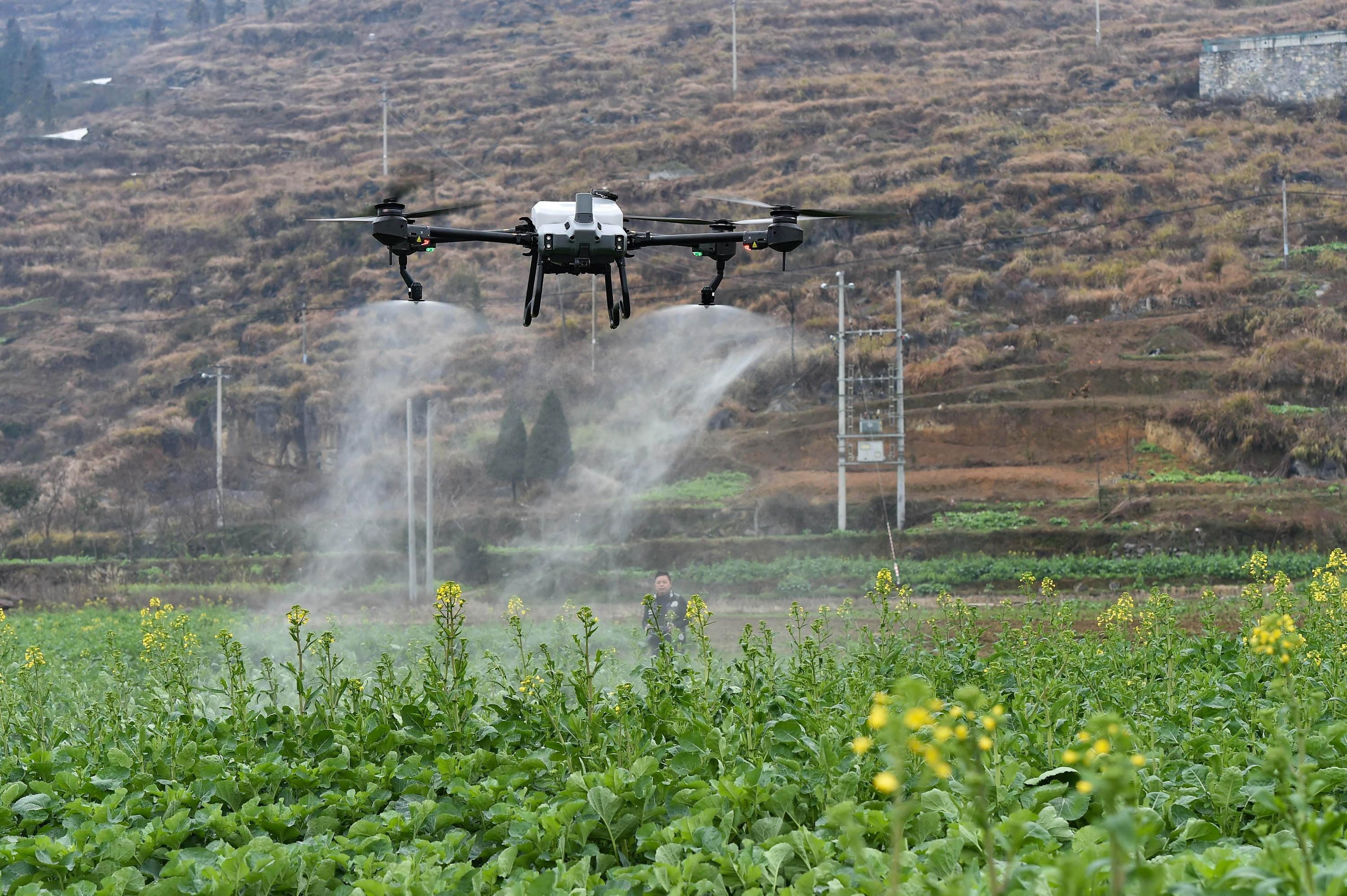 当前也是油菜管护期,麻兔村的油菜花正逐渐盛开,村民用无人机为油菜喷洒叶面肥,在把肥料装入无人机后,站在田埂外便完成了一块田的施肥作业。