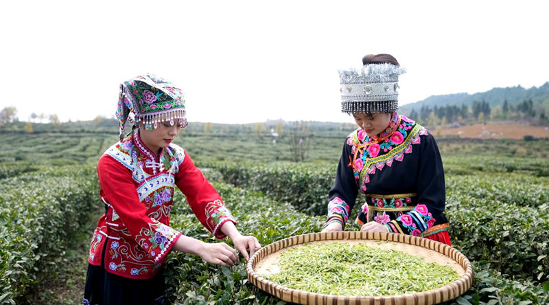 伴随着阵阵的山歌,一百多名务工村民双手在一排排错落有致的茶树间翻飞, 挎在身上的小竹篼里“躺”满了鲜嫩饱满的芽尖,脸上洋溢着收获的喜悦。