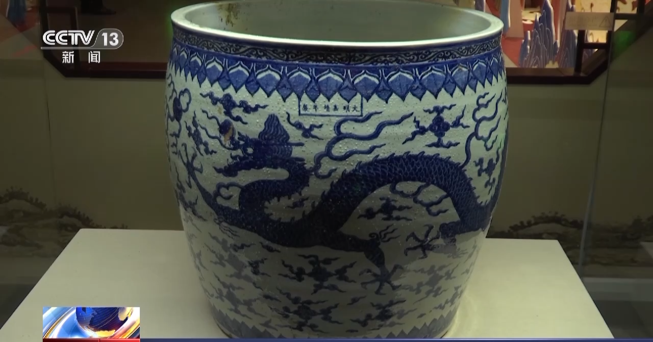 中国文物交流中心策展人 王宴姝:这是万历的祖父嘉靖年间烧制的一个青花云龙纹大缸,出土的时候这个缸里面还有油脂的痕迹。它中心还有灯芯,有一些燃烧过的痕迹,所以它有可能是长明灯。