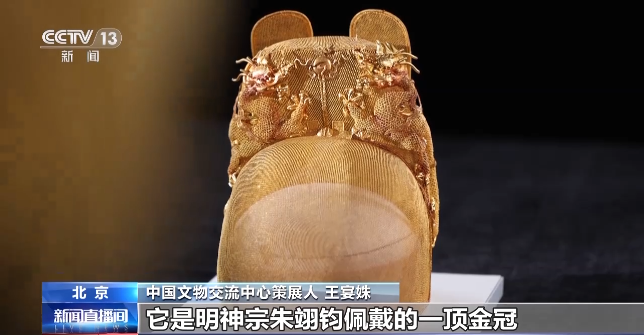 中国文物交流中心策展人 王宴姝:这件金翼善冠是此次展览最重要的展品之一,它是明神宗朱翊钧佩戴的一顶金冠。因为这个帽子的折角两个向上,就像一个扇子,所以又取名翼善。定陵一共出土了三顶翼善冠,其中一顶就是此次展出的金翼善冠,还有两顶是乌纱翼善冠。