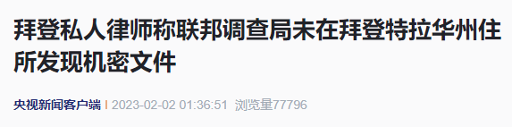 美国联邦调查局当地时间2月1日表示,对总统拜登位于特拉华州里霍博斯比奇的住所的搜查已经结束,并未发现相关敏感机密文件。