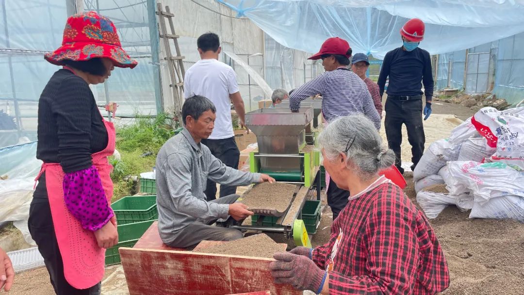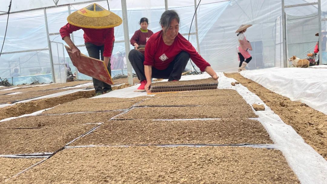 在普觉镇真旗屯社区的农业产业园内,机器轰鸣,一条水稻育秧生产线正在开足马力作业,工人们有序地将基质土和稻种加入育秧机中,摆盘、撒土、撒种、盖土等,一个个育秧盘成品源源不断地从流水线上快速完成,工人们再将其放到大棚内催芽。