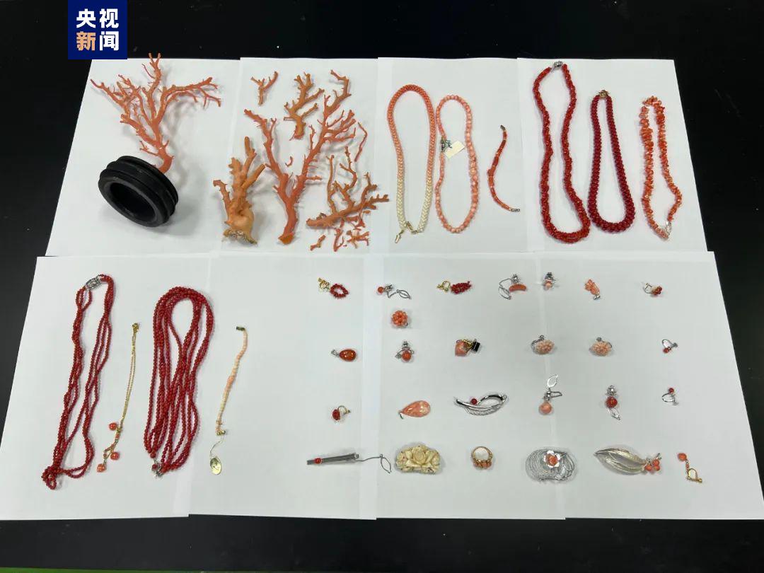 广州海关所属广州邮局海关关员在对一批进境邮件进行监管时,发现1件申报为“精华液、卸妆水”的邮件X光机图像异常。图像显示邮件内有多条链状物品和小型块状物品,与申报品名明显不符。现场关员进一步查验发现,邮件内有大量橘红色项链、耳饰等饰品,以及若干红色树枝状物品。这些物品表面光滑、纹路细腻,疑似为濒危红珊瑚制品。经送专业机构鉴定,确认上述物品为珊瑚纲软珊瑚目红珊瑚科物种制品,共44件,净重432.2克。