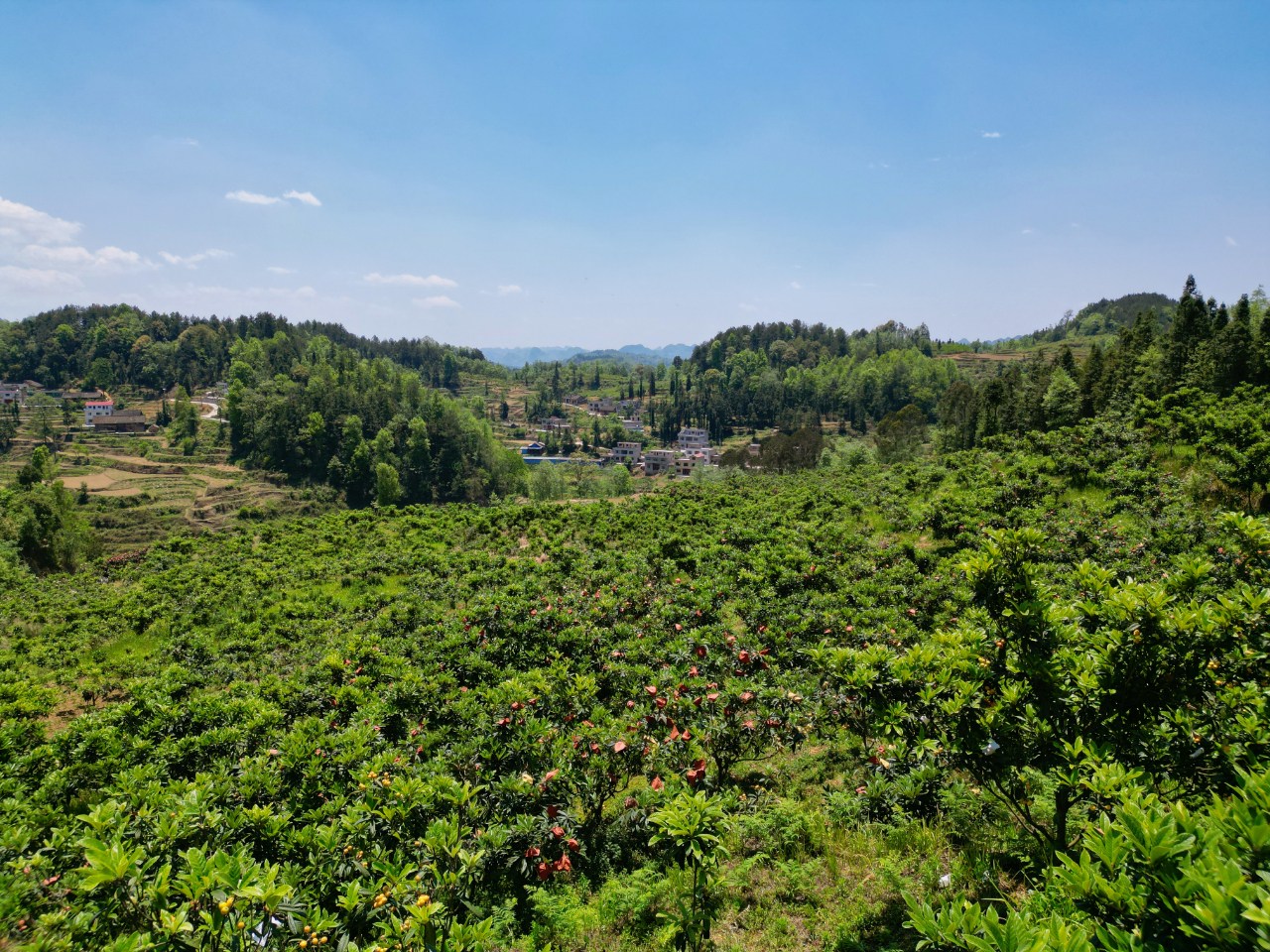 眼下这片硕果压满枝头的“金山林”,以前是板丛村远近闻名的荒山。而今,昔日的荒山、裸山、石山改头换面,变成了绿水青山、金山银山。这种变化,得益于摆所镇板丛村石漠化综合治理项目实施,板丛村根据地势、土壤等自然条件,发展枇杷种植,促进生态效益、社会效益与经济效益的协调统一。