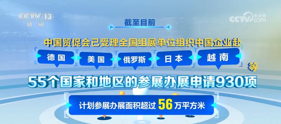 出国办展迎来新机遇。截至目前,中国贸促会已受理全国组展单位组织中国企业赴德国、美国、俄罗斯、日本、越南等55个国家和地区的参展办展申请930项,计划参展办展面积超过56万平方米。