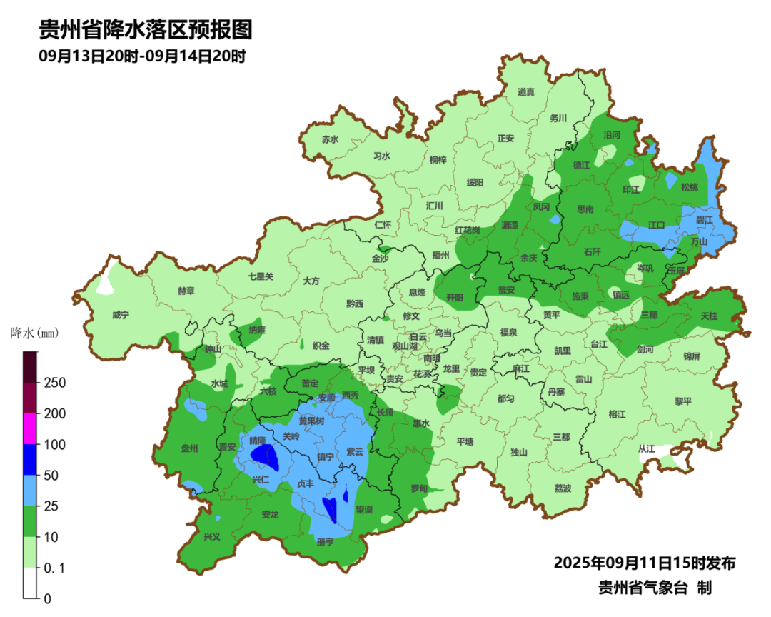 9月10日08时至09月11日08时,大暴雨出现在黔南州的三都1县域内的1个观测站(乡镇最大为三都县九阡镇水昔147.4毫米),暴雨出现在铜仁市的德江,黔东南州的丹寨、榕江,黔南州的三都、罗甸、荔波,黔西南州的兴义、安龙8县域内的17个观测站,大雨有158个观测站,中雨有463个观测站,小雨有2157个观测站。15县出现大雾(六盘水市的盘州,贵阳市的息烽,遵义市的务川、正安,铜仁市的万山、德江、江口、沿河,黔东南州的丹寨、锦屏,黔南州的平塘、罗甸、都匀,黔西南州的兴义、贞丰),最低为锦屏县95.0m。